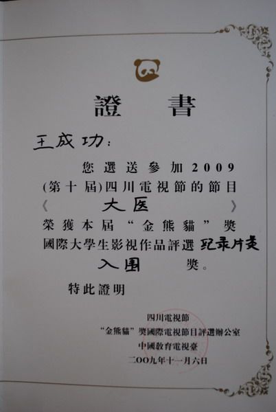 不久前,由国家广播电影电视总局和四川省人民政府主办的第十届四川国际电视节在成都落幕。在这届广播影视盛会上,公司选送的由杨波老师指导,王成功、康探等同学创作的纪录片作品《大医》、《守望》荣获“金熊猫”奖国际老员工影视作品评选纪录片类入围奖。