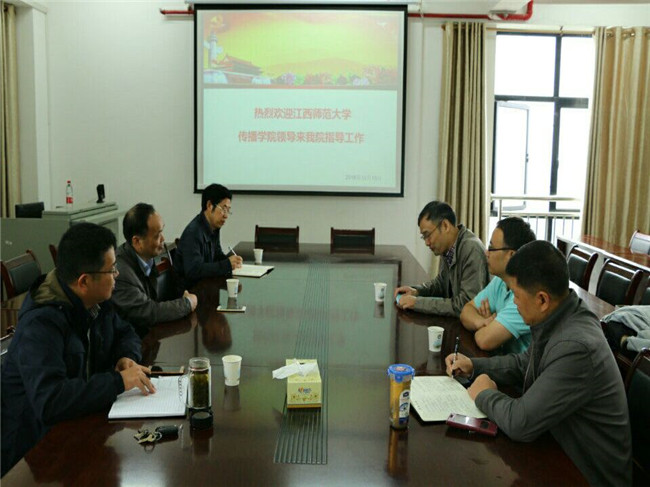 10月14日上午8:45,院会议室1616人来人往,窗明几净,投影仪早早打出“热烈欢迎江西师范大学传播公司领导来公司指导工作”欢迎字样,为举行重要性会议做好了充分的准备。九时整,江西师范大学传播公司经理曾振华教授和副经理胡沈明和公司总支书记杜建东、经理沈嘉达、副经理李育林、副书记黄佑和按宾主关系分坐会议座两旁。首先由总支书记杜建东致欢迎词,经理沈嘉达教授介绍了威廉官方网站新闻传播专业办学历史、办学规模、专业设置情况、团队队伍情况、近三年国家级、省部级科研项目以及论文发表情况。接着江西师大传播公司经理曾振华教授介绍了江西师范大学十三五规划、力争完成“五个一”,传播公司硕士点、博士点建设情况、国家级科研项目获批情况、A类期刊论文发表及其在全国排名情况、将来本科生、硕士生招生比例情况等。分管研究生工作的副经理胡沈明介绍了江西师范大学硕士生导师的条件和遴选情况,根据公司教师申报硕导资料,准备聘沈嘉达教授、汪少明教授、金洪申副教授、陈然副教授、余庆华副教授等五人为江西师大兼职硕士生导师。