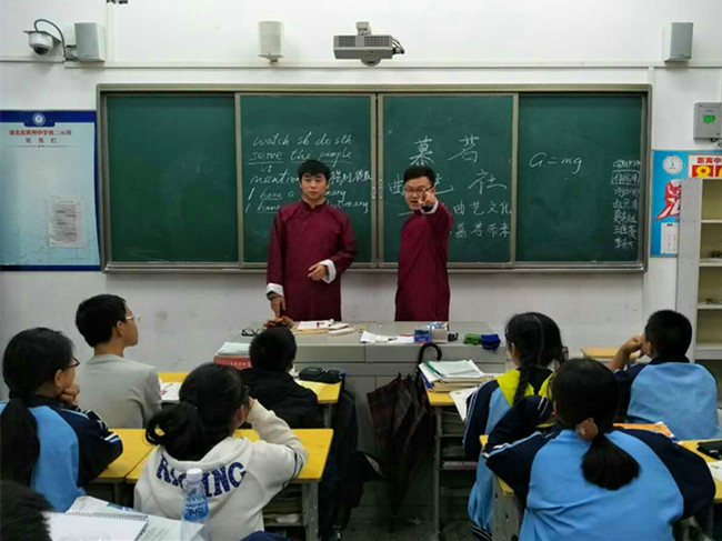 16、17日下午,8位成员在明蕾老师的带领下,到初一初二年级各班跑班宣传。8位成员穿着相声大褂,为同学们表演了小段的相声、快板、评书和小品。同学们近距离感受到了曲艺文化的魅力,爆发出阵阵笑声和掌声。同时,曲艺社成员还为大家讲述了相声快板等传统曲艺的由来和发展历史,激起了大家对于传统文化的兴趣。