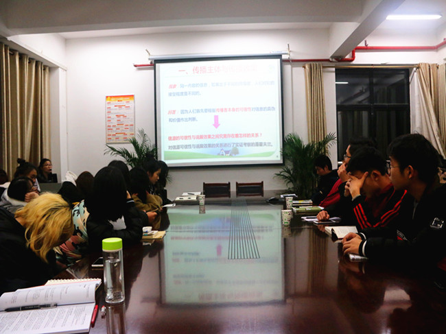 陈然博士主要从传播主体与传播效果,传播技巧与传播效果两个方面分析了卡尔•霍夫兰的说服研究。她首先为大家详细介绍了传播学先驱卡尔•霍夫兰,随后向同学们展示了霍夫兰对可信性的研究过程以及结果,提出了“可信性效应”的概念,即信源的可信性越大,其说服效果越大。陈然博士还列举了常用的传播技巧,并与同学们讨论互动,以实例增强大家对说服理论的理解。