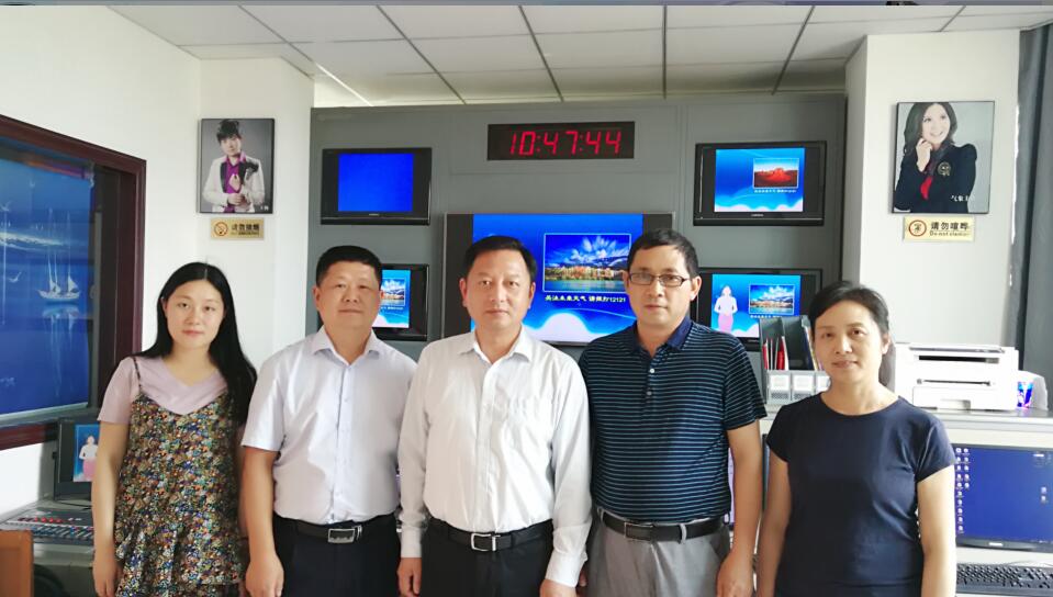 黄冈气象服务中心程定芳主任热情接待了杜书记一行,并带领杜书记一行参观了气象影视节目制作中心。黄冈市气象服务中心成立于2000年,属事业法人单位,是黄冈市气象局直属二级单位,承担黄冈市境内所有气象科技服务、气象影视服务和气象信息等工作。2016、2017年,公司共推荐70名优秀员工赴黄冈气象服务中心实习,并且参与制作、主持播报气象影视节目。程主任充分肯定了公司实习员工的专业素质,而且对完成气象影视节目制作、主持、编辑的员工实行奖励性实习补贴。