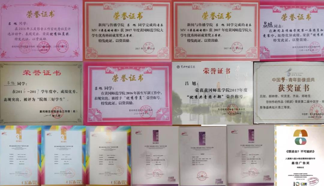 大学期间,吕旭共创作原创作品11部,摄像、制作作品百余部。他把优秀当成了一种习惯, 他说既然选择了远方,便不顾风雨兼程,凭着一腔热血,演绎着属于自己的艺术人生。