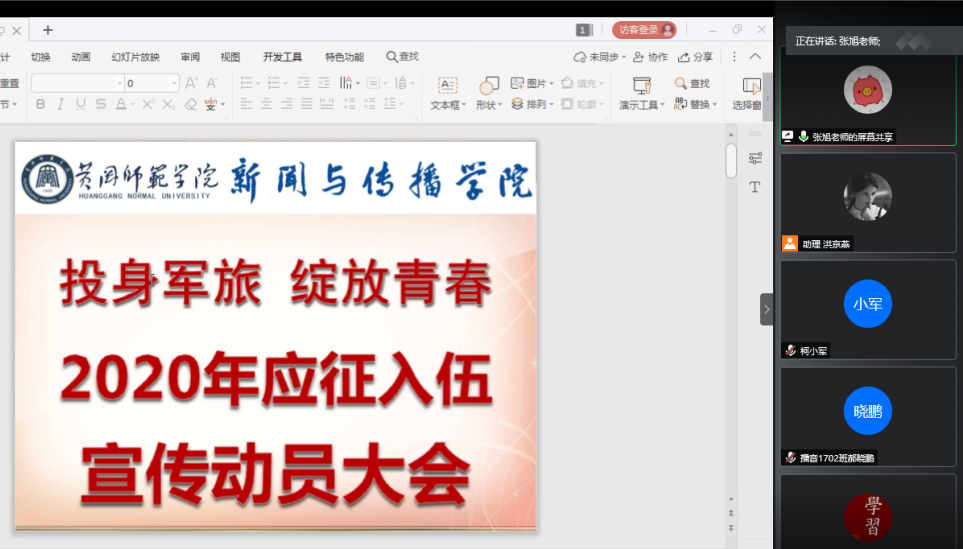 依法服兵役,征兵我光荣。为贯彻落实国家征兵政策,鼓励在校老员工响应国家号召应征入伍,投身军旅,绽放青春,公司于7月23日晚7点线上召开了2020年度征兵宣传动员大会,公司党委副书记黄佑和出席会议,公司全体男生参加了会议。