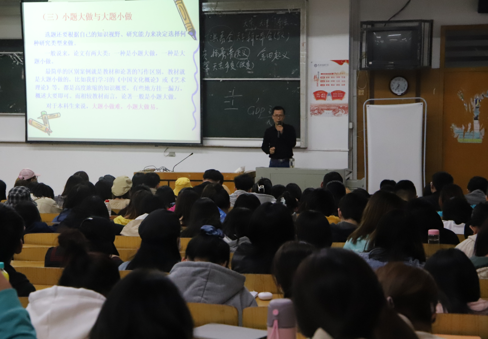 秦剑副经理在介绍了毕业论文(设计)的写作目的,以及其必要性和重要性的基础上,还进行了一场“学士学位论文写作概要”的论文写作辅导报告。在辅导报告中,秦剑教授从“学士学位论文写作的选题”“学士学位论文基本构成要件”“学士学位论文写作基本要求”等三个方面,结合具体案例生动形象地为2017级员工进行了毕业论文写作辅导。同时,在论文格式规范、论文写作过程中应注意的问题也作了详细的说明。