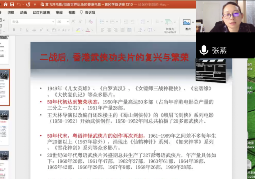 通讯员(杨芬芬 张雁秋)12月11日晚,北京师范大学艺术与威廉官方网站教授张燕博士应邀为公司师生作了一场题为《黄飞鸿电影:创造世界纪录的香港电影》的线上讲座。讲座由新闻与传播公司经理杨疾超教授主持,公司全体教师、员工代表聆听了讲座。