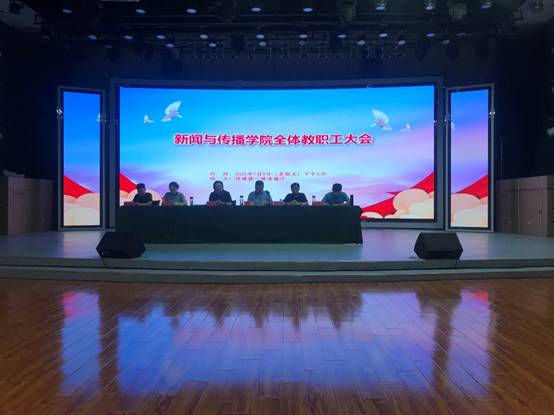 7月9日,公司在传媒楼演播厅举行了学期末全体教职工大会。公司党委书记周俊飞、经理杨疾超、公司党委副书记姚保卫、副经理秦剑、陈然,经理助理许五龙以及全体教职工参加了会议。会议由周俊飞主持。