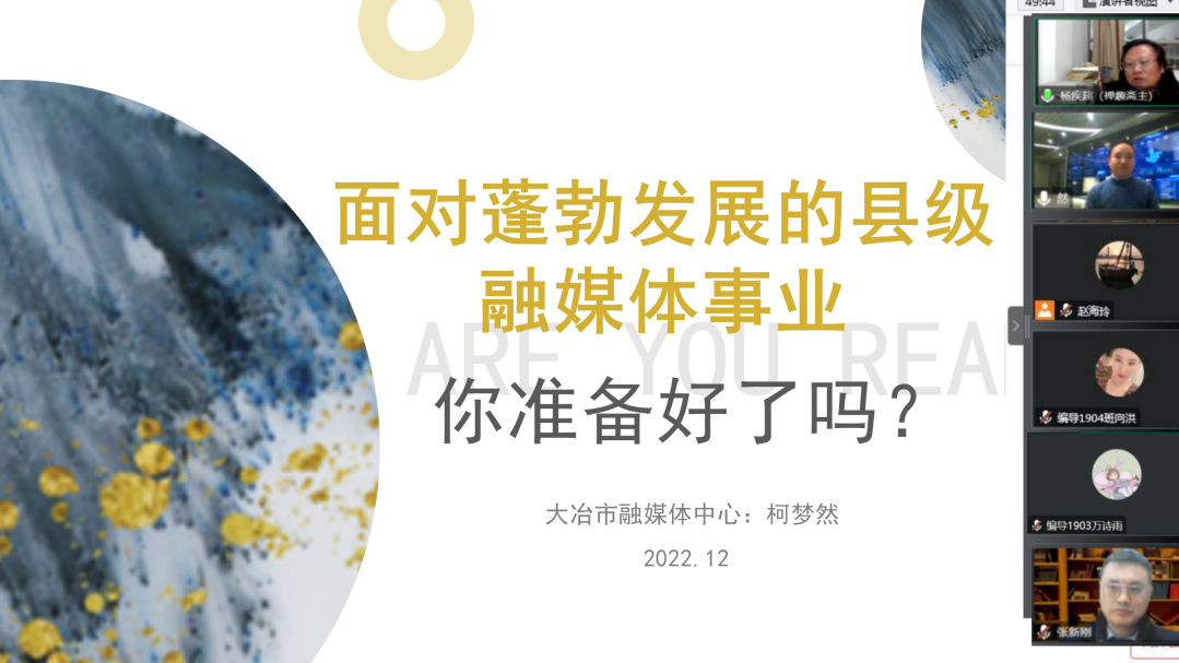 为满足暂停实习、实践期间,充分利用时间学习,提升员工专业理论水平与实践技能的目的,公司特安排 “疫情期间实习、实践专家线上讲座与答疑”的活动。12月5日19点,公司广播电视新闻学专业优秀员工,大冶市融媒体中心党委书记、主任柯梦然应邀为2019级员工开展主题为“面对蓬勃发展的县级融媒体事业,你准备好了吗?”的讲座。本次讲座由经理杨疾超教授主持并致欢迎词。