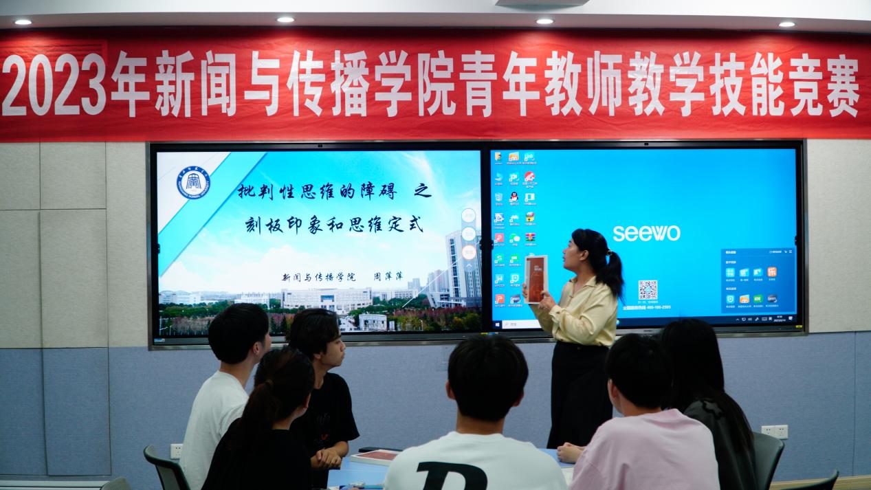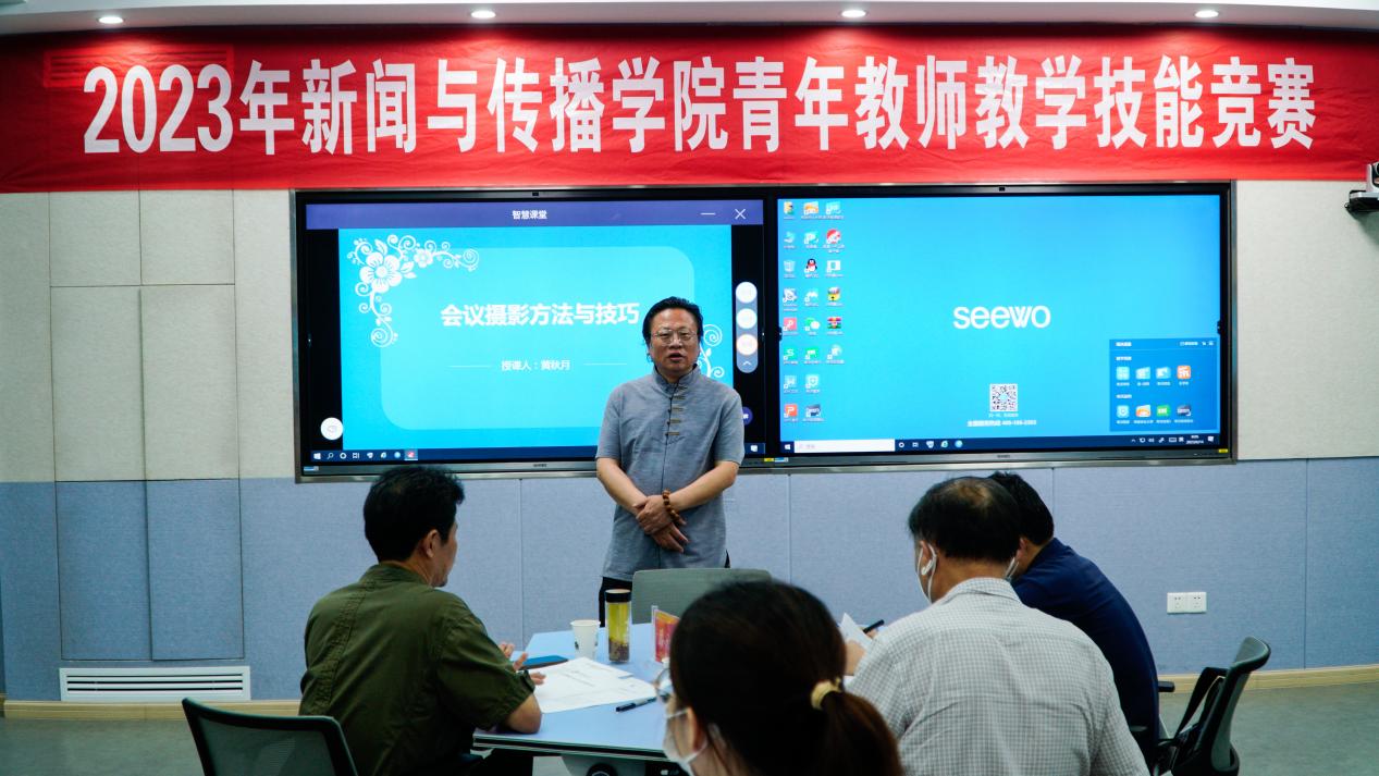 为全面提高教师公司产品水平和课堂教学质量,促进教学思想转变和教育理念创新,公司于6月14日上午8时在求实楼410教室举行2023年度青年教师教学技能竞赛活动。文科督导组组长吴仲华教授、新闻与传播公司教学督导员蔡小平教授、新闻与传播公司副经理陈然教授、经理助理张新刚博士、专任教师汪少明教授及各教研室主任担任专家评委。公司班子成员及全体专任教师参加本次活动,竞赛由副经理孙喜杰主持。