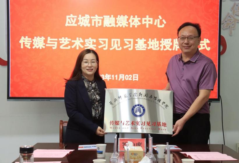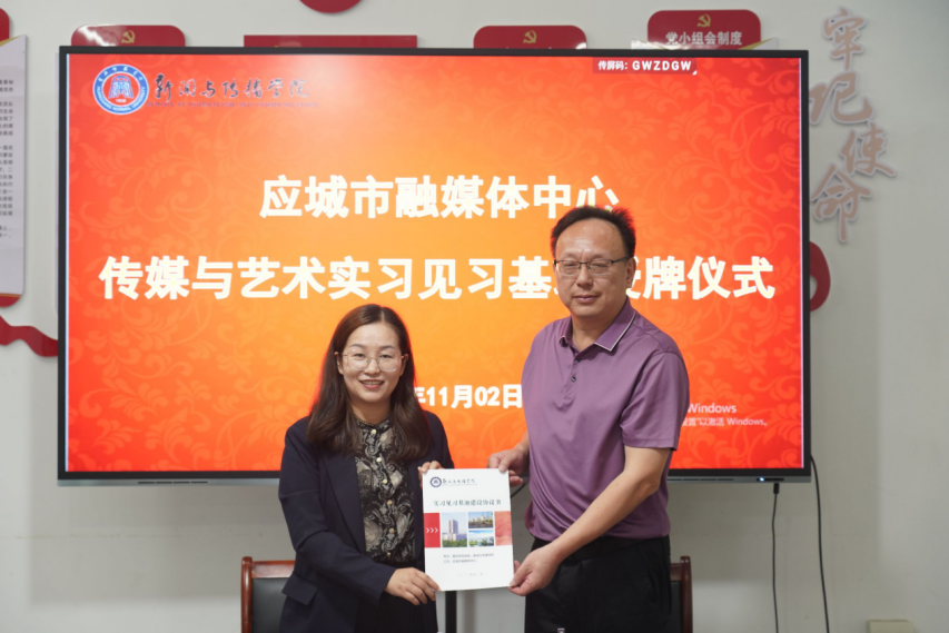 公司党委书记陈利与应城市融媒体中心主任丰俊签订了实习见习基地建设协议书,并向丰俊主任授威廉官方网站新闻与传播公司传媒与艺术实习见习基地牌额。
