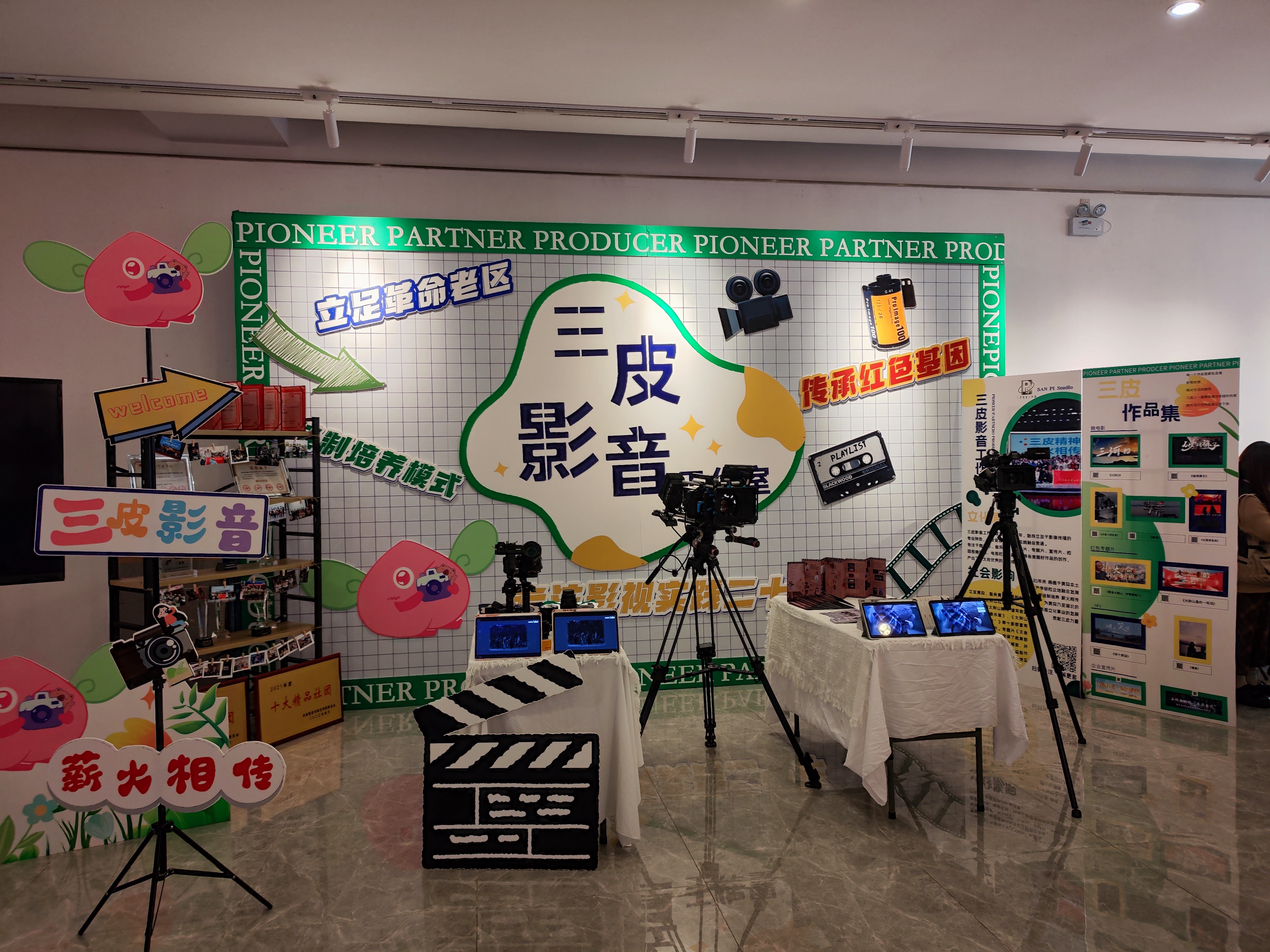 活动现场,三皮影音工作室立足于广播电视编导专业特色,结合影像传播的实践特点进行多维度布展,充分体现了三皮影音工作室成立21年来,立足黄冈革命老区,传承红色文化,赓续红色血脉,以师徒制的工作坊培养模式,通过产学研、校企地融合发展,为黄冈乃至湖北的影视文化发展贡献影像力量。