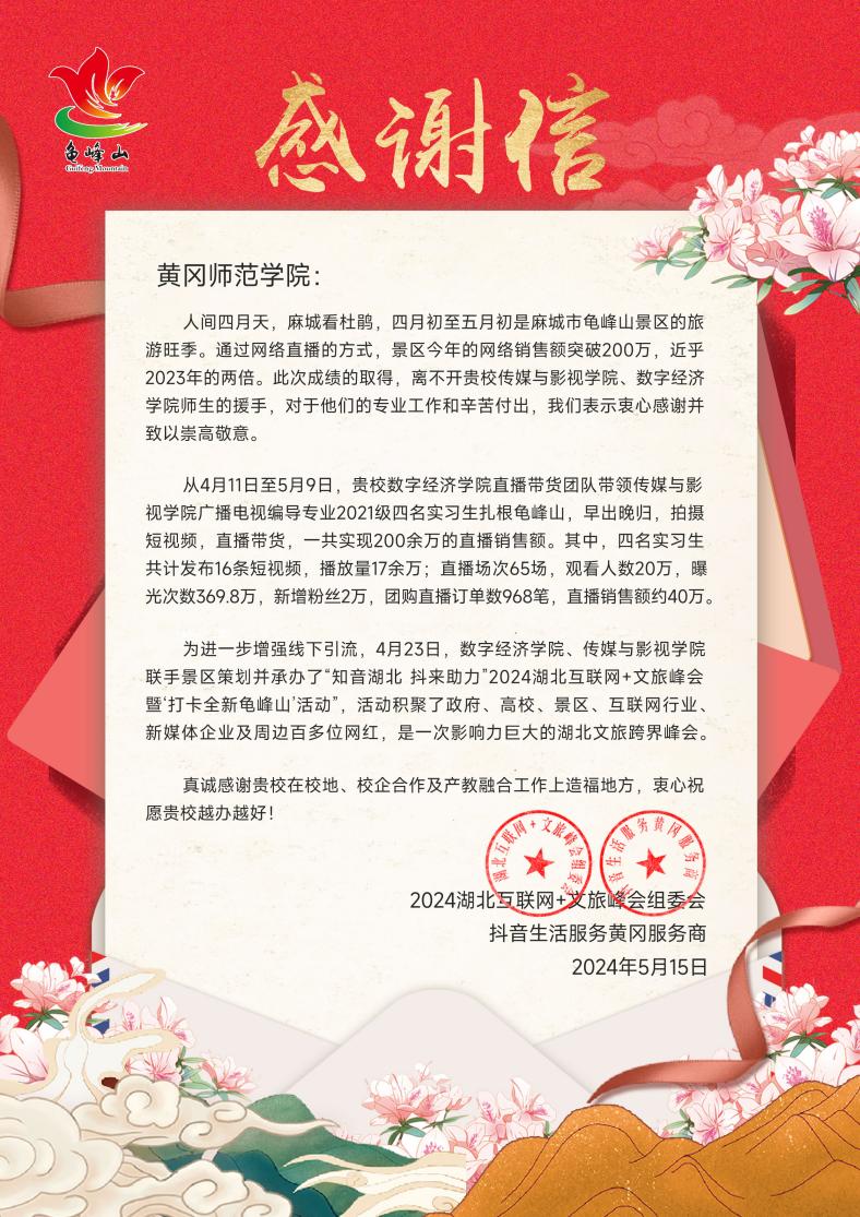 师生齐心,群策群力,每周复盘,集体的付出赢来了丰厚的回报。截止511日,团队一共实现200余万的直播销售额,其中,4名实习生共计发布16条短视频,播放量17余万;直播场次65场,观看人数20万,曝光次数369.8万,新增粉丝2万,团购直播订单数968笔,直播销售额约40万。520日,公司收到麻城龟峰山景点管理处、抖音生活服务商联名发来的感谢信,他们对公司师生的付出表示感谢。