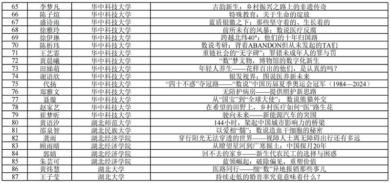 经由来自学界、业界的专家匿名评审,湖北省赛区组委会复审核查,第九届中国数据新闻大赛湖北省赛决赛共有87份数据新闻作品入围,现予以公示。