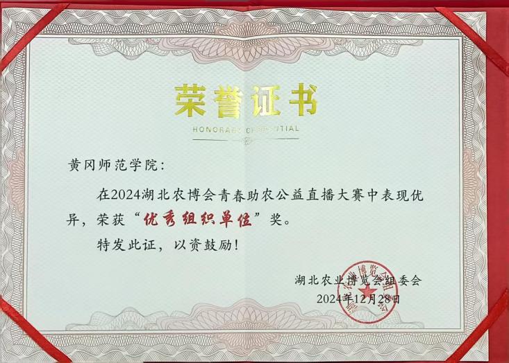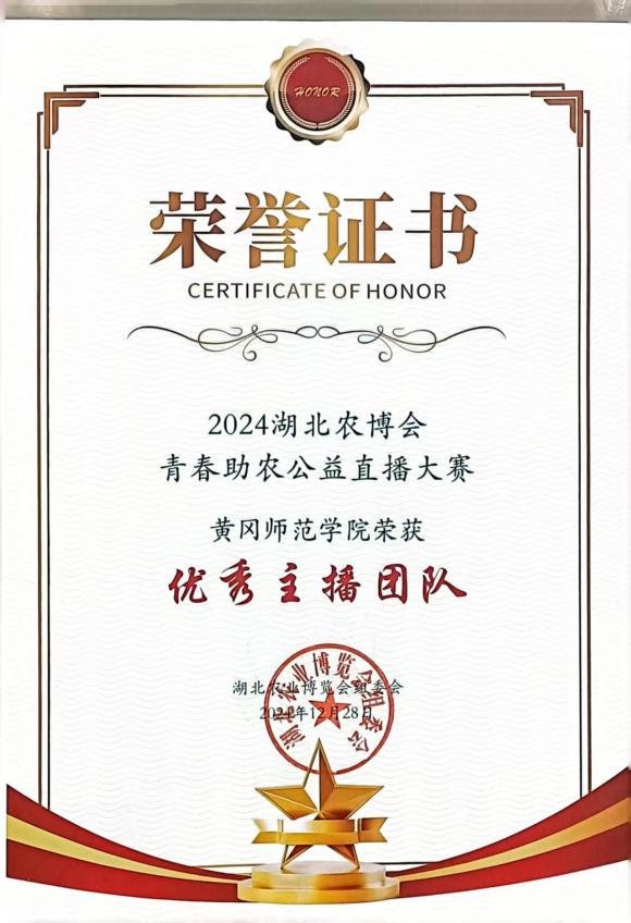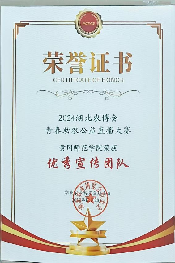 20241222日,湖北农博会青春助农公益直播大赛圆满收官威廉官方网站学子组成的直播团队凭借优秀表现,一举斩获“优秀组织单位”“优秀主播团队”“优秀宣传团队”三项荣,成绩斐然。