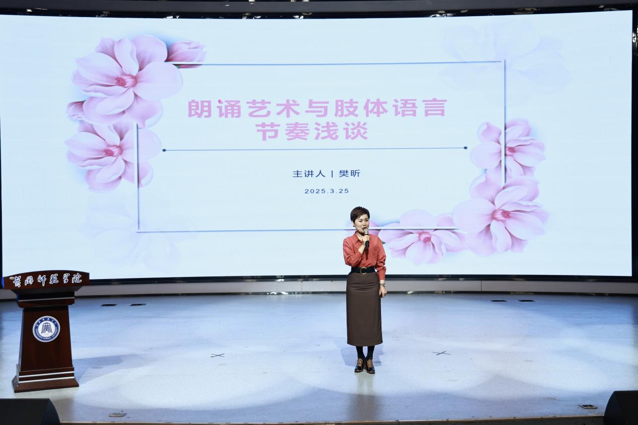 在随后举行的湖北省朗诵艺术家协会《会员大讲堂》活动中,樊昕老师带来了精彩的主题讲座——《朗诵艺术节奏与肢体语言节奏谈》。樊老师从“深入研读作品,是准确把握节奏的前提”“在呼吸中体会节奏的变化”“在情感波动中体会节奏的变化”三个关键方面展开论述,并以经典作品《等待》《南方北方》《疯马》为例,通过示范朗诵,生动地分析了朗诵表达节奏中的情感律动以及肢体语言节奏所营造的审视意境。