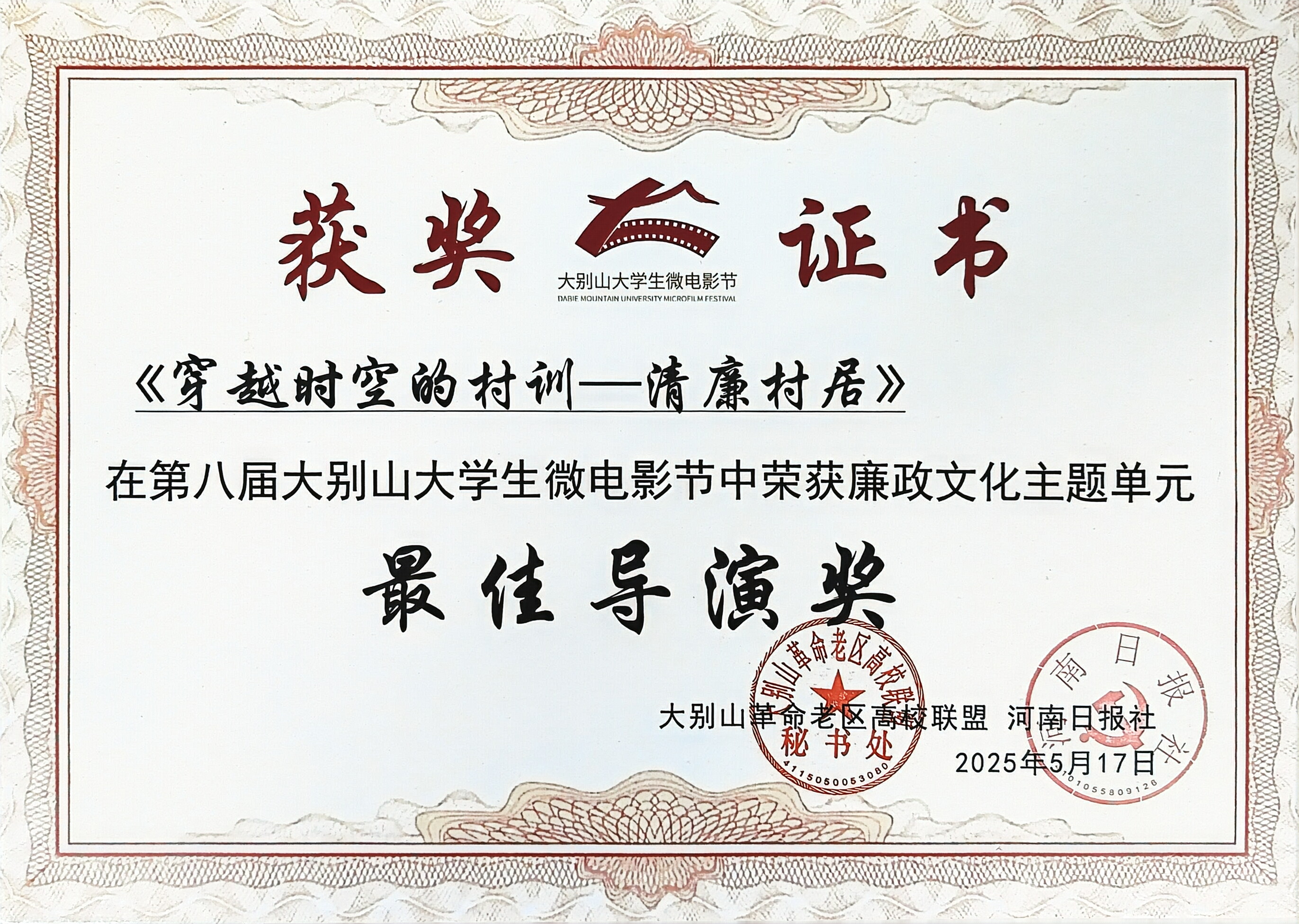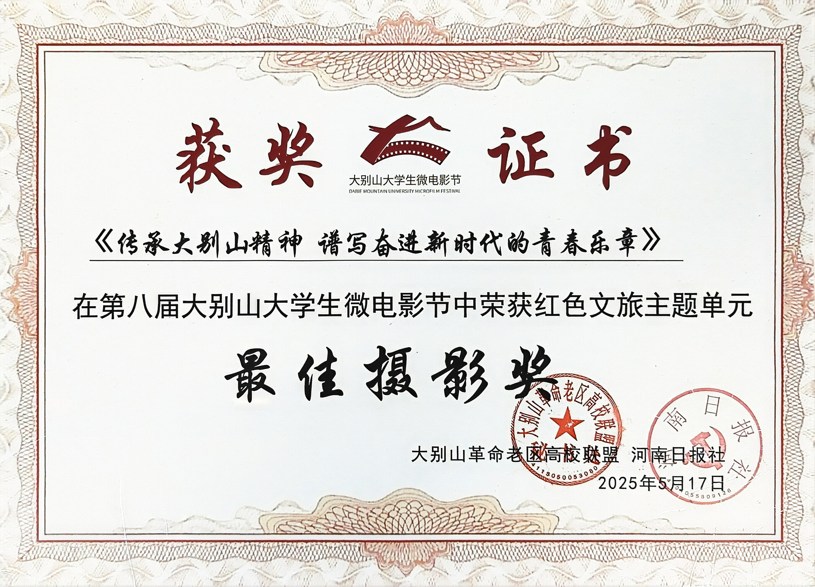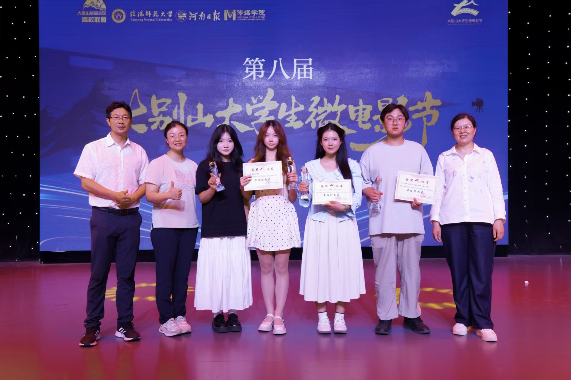 5月17日晚,由大别山革命老区高校联盟、信阳师范大学、河南日报社主办的第八届大别山老员工微电影节圆满落幕。公司斩获“最佳摄影奖”“最佳创意奖”“最佳导演奖”等4项大奖,助力公司荣获“优秀组织单位奖”。