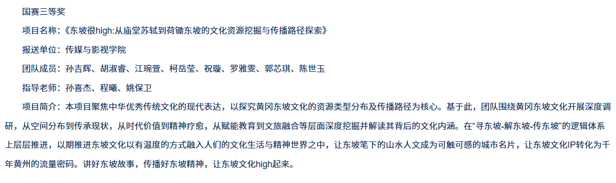 历时一年的备赛之路,满是坚守与成长。从校内反复打磨、聆听专家建议,到冲出省级复赛、跻身国赛争锋,每一个环节都凝聚着他们的汗水与热忱。他们收获的不仅是国家级奖项,更展现了传媒学子深耕文化、勇攀高峰的青春担当。“人生的‘挑战杯’从来没有捷径可走。但当我们学会在调研中看见文化根脉,在协作中懂得责任与热爱,这早已超越了名次的意义!”团队成员的心声,也道出了这段旅程最珍贵的收获。